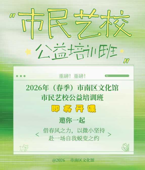 市民朋友们请注意! 经过了热火朝天的报名 2026年(春季)市南区文化馆 市民艺校公益培训班 将于下周二正式开课啦 |开课...