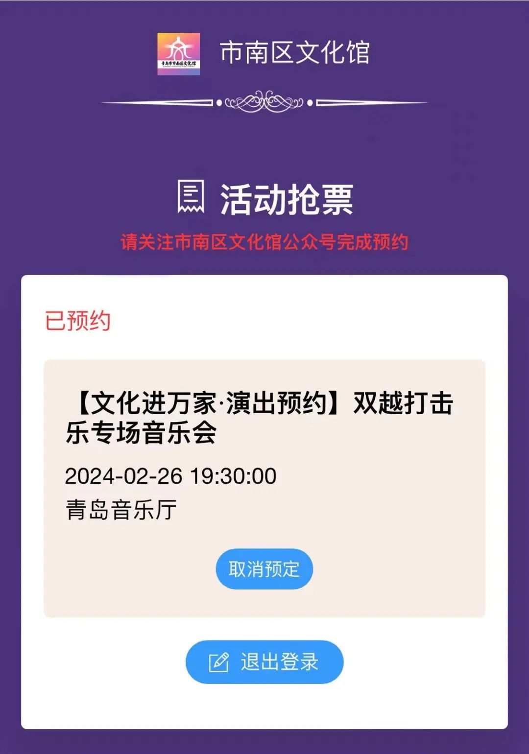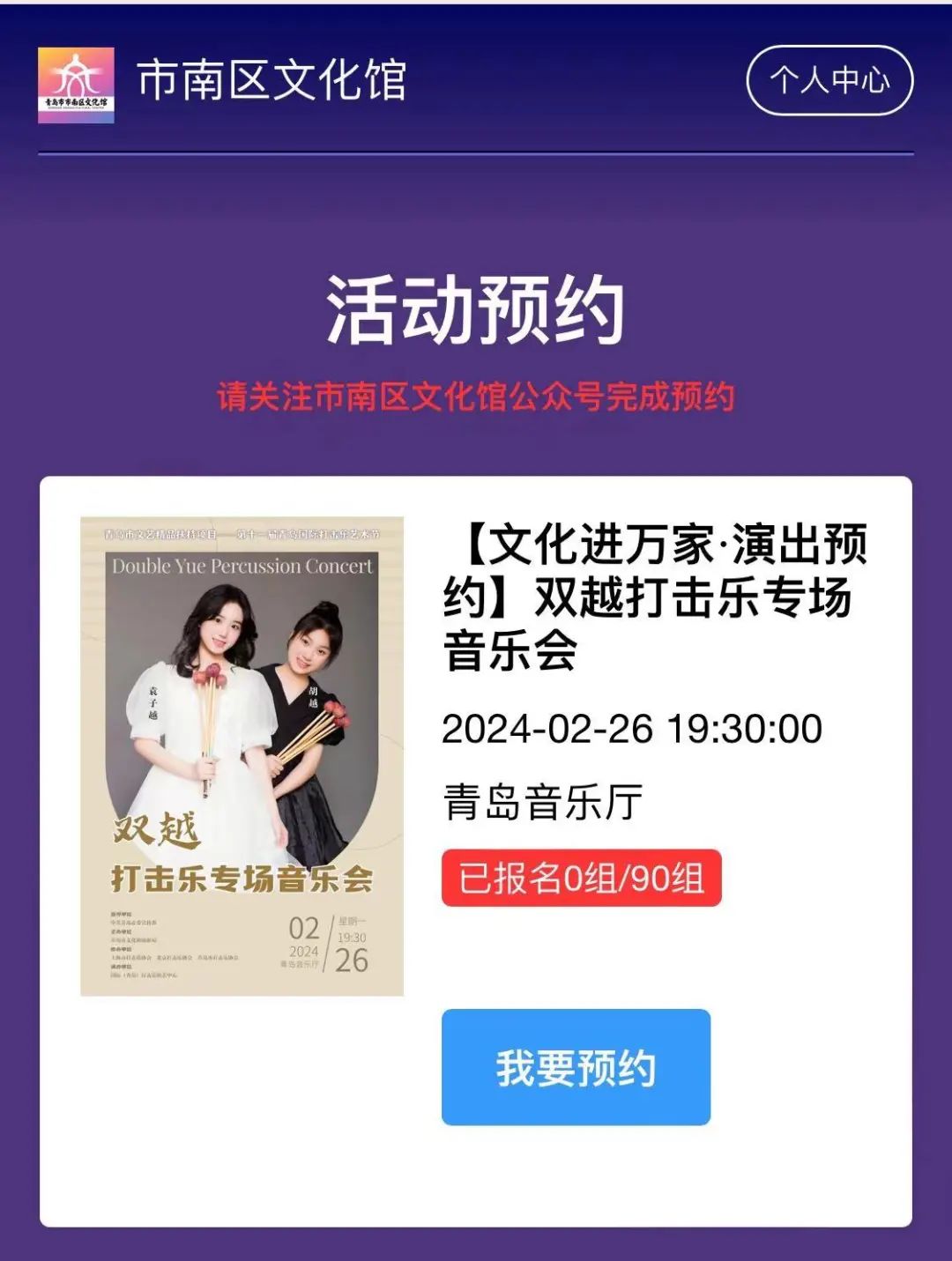 1、点击本条推文文末“阅读原文”,并关注市南区文化馆公众号-线上服务-活动预约,参与演出预约。