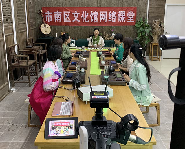 这是市南区文化馆“网络课堂”--茶艺课“春意盎然品新绿”的上课现场,国家级茶艺师朱亚英老师正在给线上的观众、线下的学员们授课。