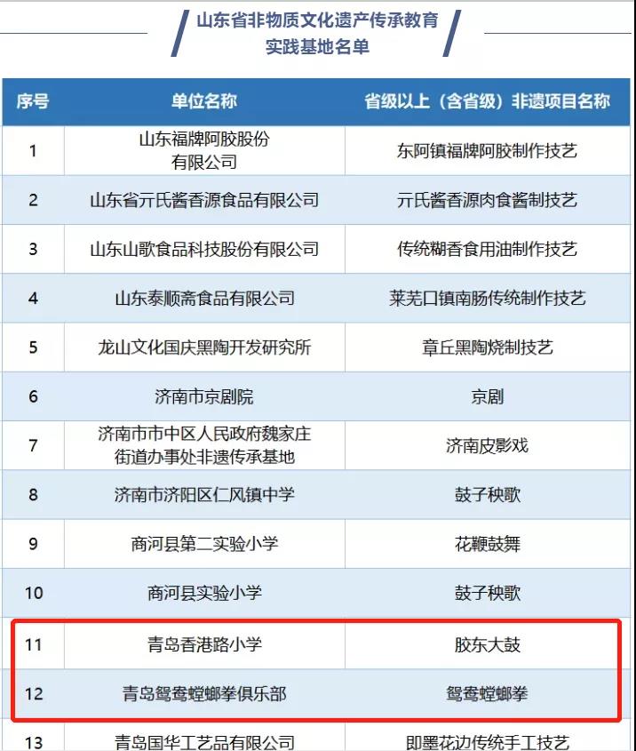为贯彻落实中共中央、国务院《关于进一步加强非物质文化遗产保护工作的意见》,提高全省非遗系统性保护能力和水平,2021年,省文化和旅游厅部署开展了全省非物质文化遗产传承教育实践基地评选工作。经各市和有关单位推荐、专家评审、公示等环节,共认定100个山东省非物质文化遗产传承教育实践基地。其中,市南区非遗传承教育实践基地青岛香港路小学(胶东大鼓)、青岛鸳鸯螳螂拳俱乐部(鸳鸯螳螂拳)上榜。