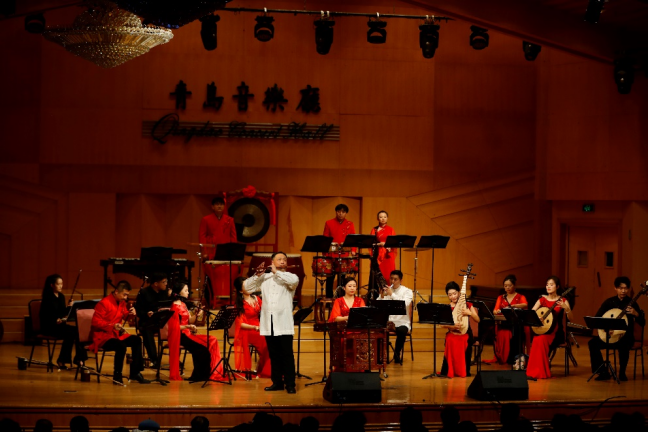 音乐会在荣获省级奖项的原创情景音乐《老街故事》中温情启幕,以音符绘就老青岛的市井风情。整场演出曲目编排精湛,既有《月下丽影》这样的全国首演作品,展现箫与箜篌的千年古韵;也有《二泉映音》《霸王卸甲》等经典名作的创新编配,在深沉与壮阔中尽显国乐张力。特别演绎的《新编百鸟朝凤》大胆引入戏剧化概念,以笛唢竞奏实现传统与现代的和谐共鸣,成为全场瞩目的艺术突破。