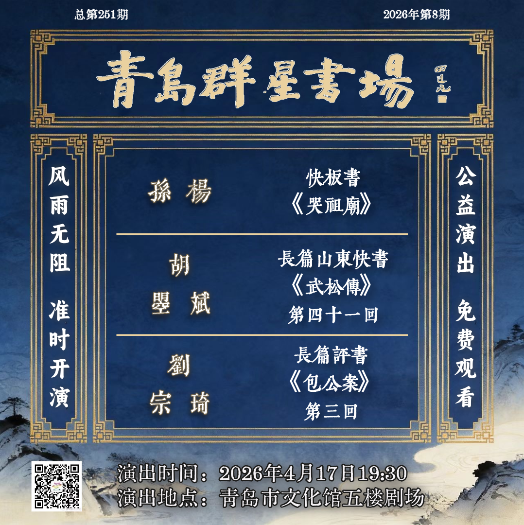 各位老铁、戏迷、新朋友!上周末的笑声还在耳边没有散去,本周五晚,青岛“群星书场”曲艺专场又将开张!
